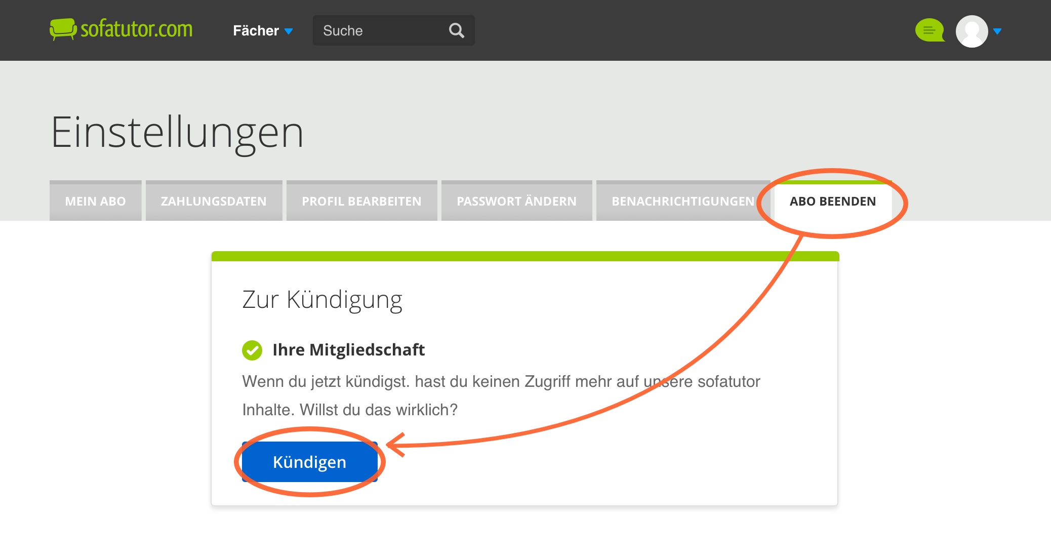 Unsere Abos verlängern sich nach Laufzeitende um die eigene Laufzeit zum unrabattierten Preis. Wenn Sie sofatutor nicht mehr nutzen möchten, so genügt die rechtzeitige Kündigung in Textform (z. B. per Brief, Fax oder E-Mail). Im 12- oder 24-Monats-Abo haben Sie hierzu bis zu 14 Tage vor Laufzeitende Zeit.